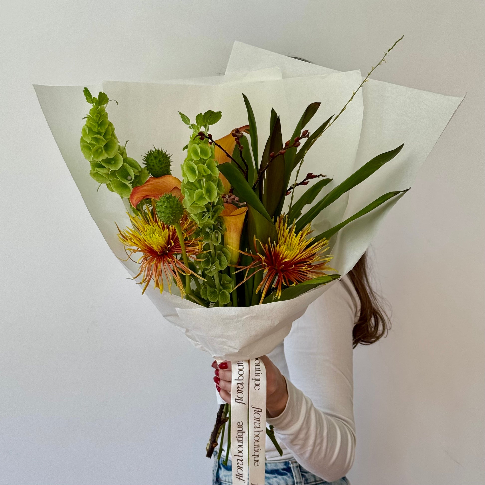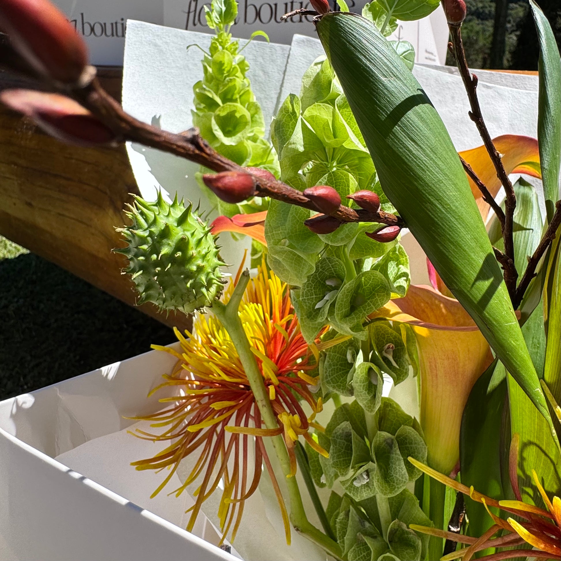 Vibrante na medida certa, traz callas em tons de laranja combinadas a diferentes texturas e alturas, em uma composição sofisticada e cheia de vida.